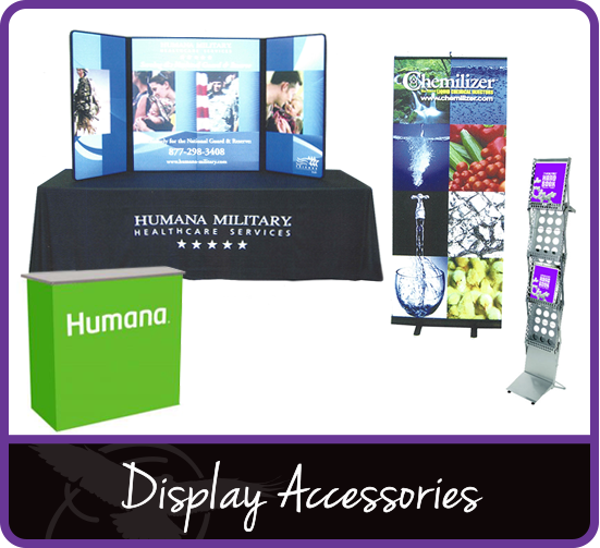 Display accessories include but are not limited to banner stands, literature racks, logoed table throws, portable podiums, lighting and much, much more. Display Accessories offer functional and unique ways to display your peripherals.