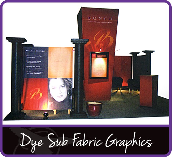 Dye Sub Fabric Graphics allow you to create seamless graphics that can attach to almost any size or shape of display. Dye Sub Graphics can be used indoors or outdoors. The movement this type of graphic creates is very eye-catching. This style of graphic can have graphics on 2 sides to create a lightweight wall system. Dye Sub Graphics can be printed the size of a football field or larger by sewing fabric panels together. They are machine washable and can easily be maintained indoors or outdoors.